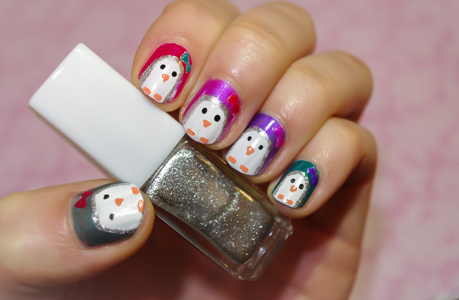 Here is my first nail art, cute colorful penguins. I used mostly Sally Hansen varnishes, as you can see from the second photo.